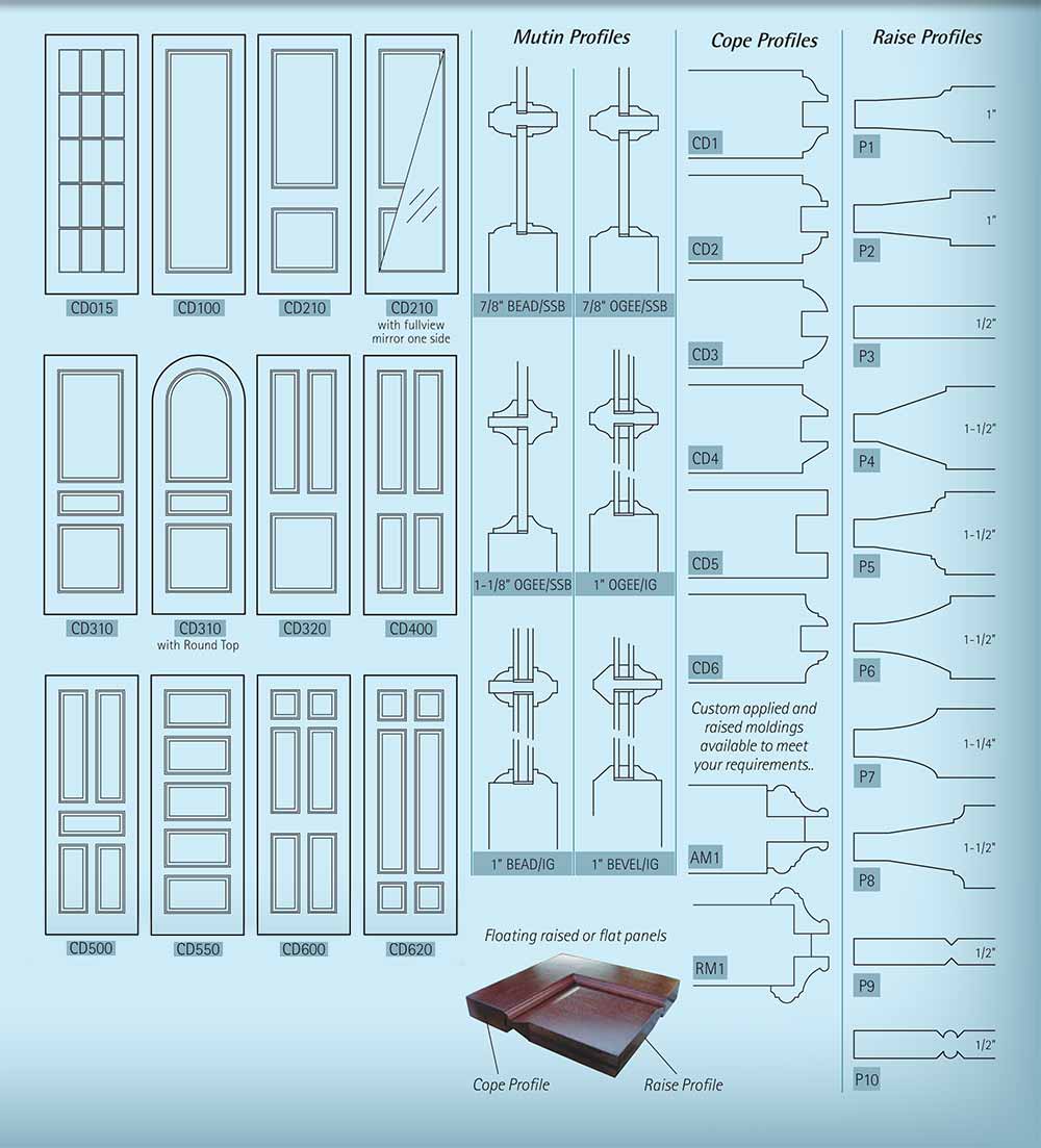 See for yourself how our wide selection of profiles and elevations will add beauty, elegance, and a signature style to all your entrances and exits! Note: All doors are available with fullview mirror one side. Custom arch top doors available in any style.